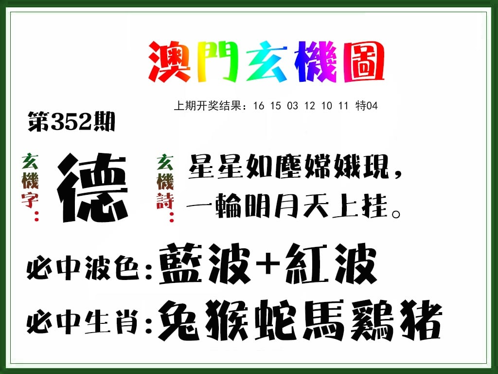 | 352期: ⑧肖 | 牛猴猪狗虎蛇兔鸡 | ????中 |